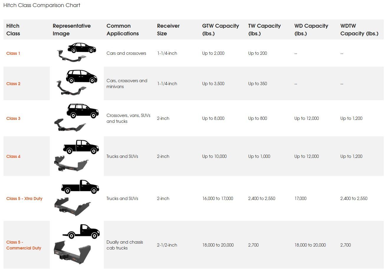 Once you have determined the weight of your trailer and your vehicle’s towing capacity you can decide which type of hitch you will need. Trailer hitches are available in five weight classes to accommodate every different type of trailer and vehicle. Use the following chart below to help you choose which hitch you need.